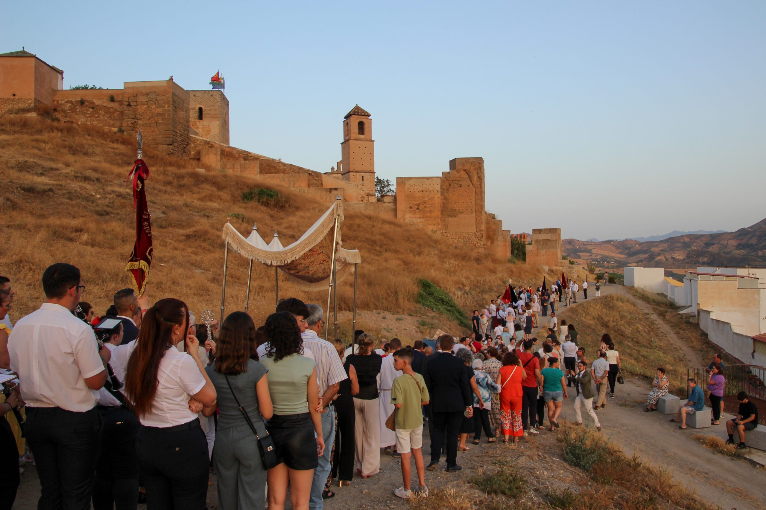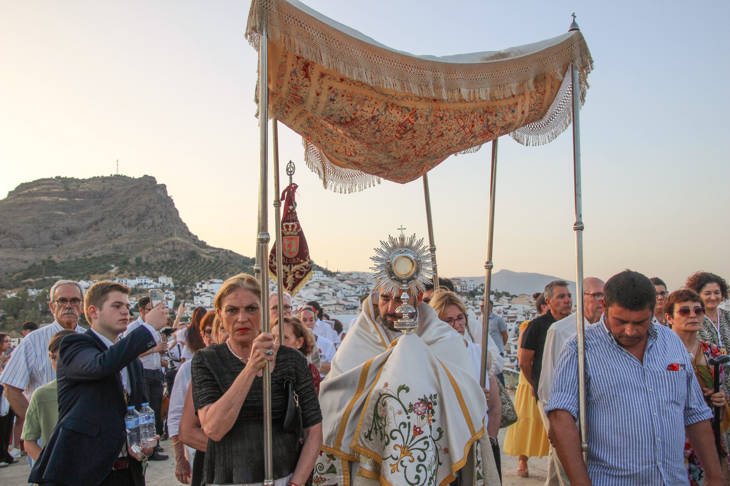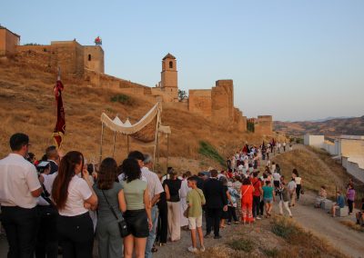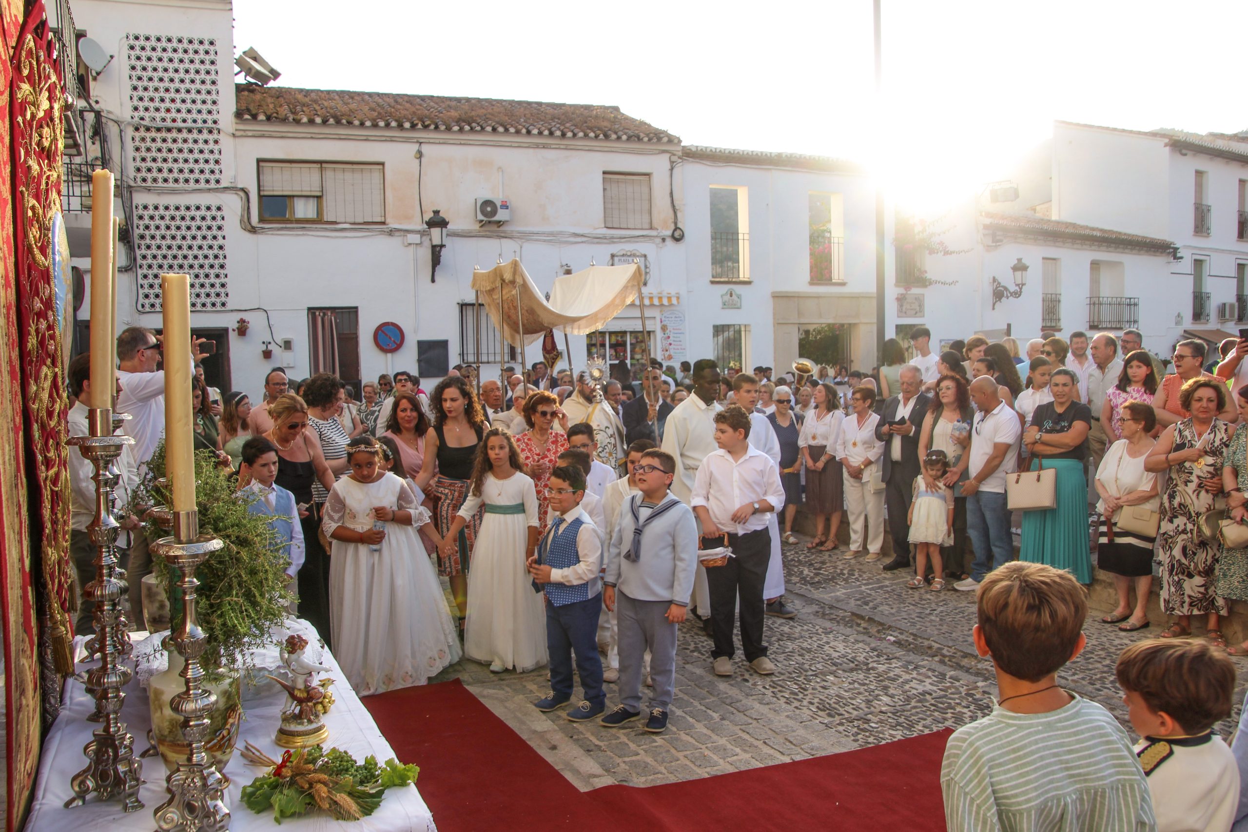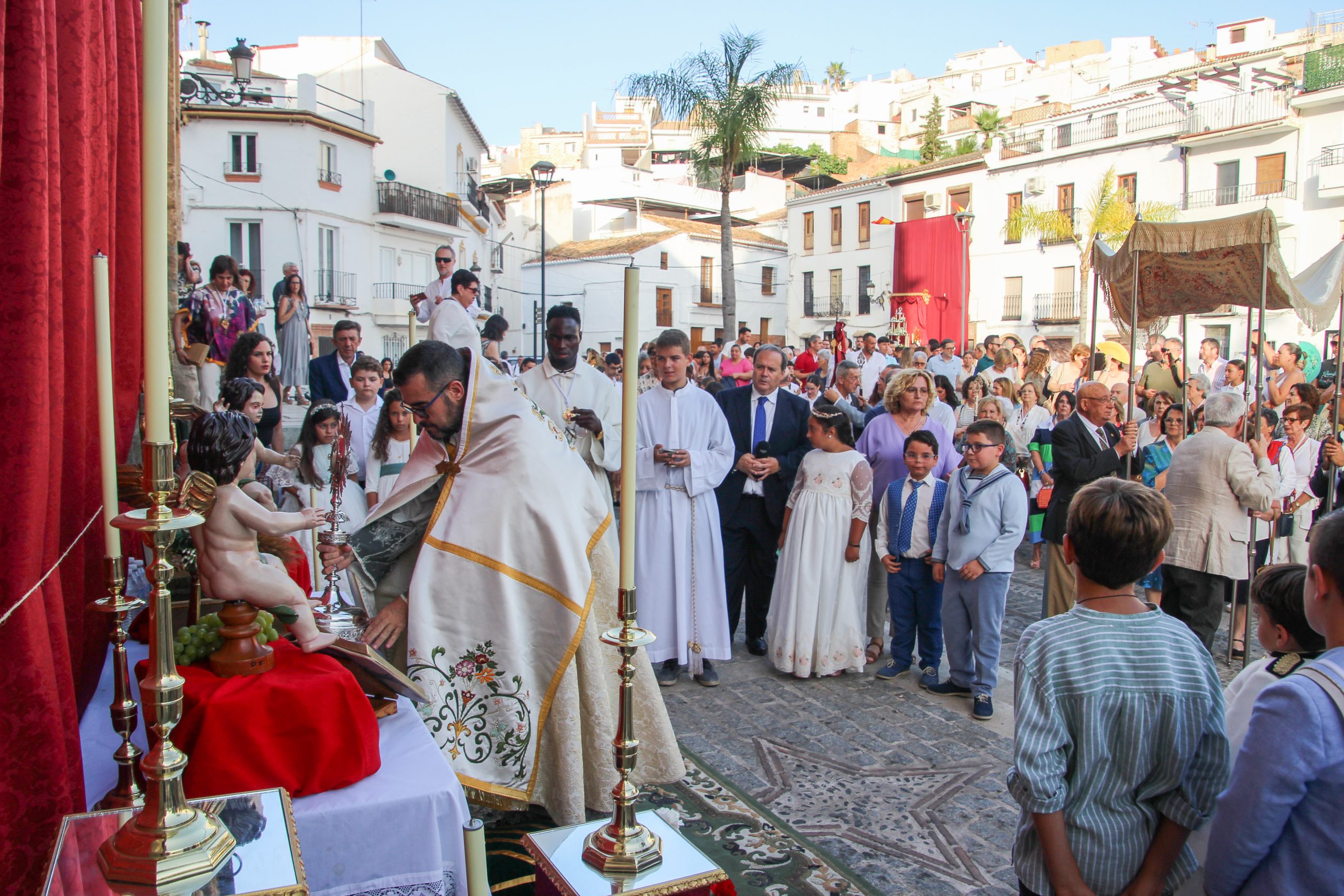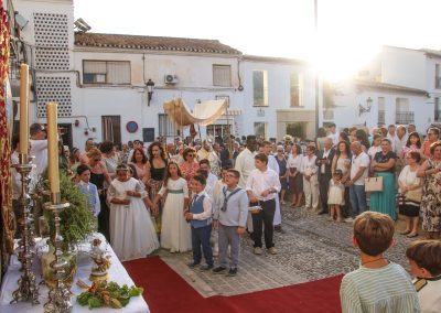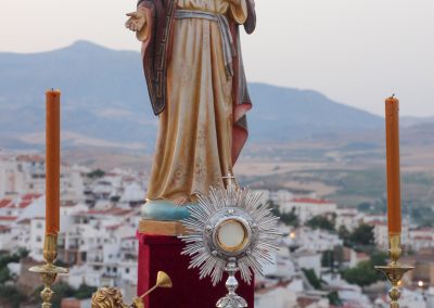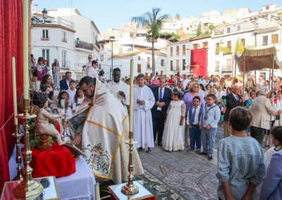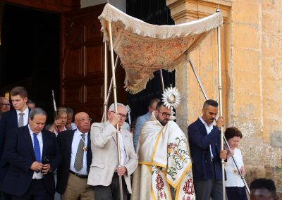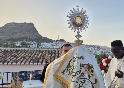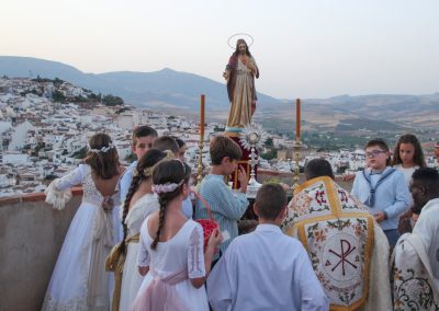 En la tarde,  Santa Misa en la Parroquia Ntra. Sra. de la Encarnación. Después de la misa se ha realizado la Procesión del Corpus Christi desde la Parroquia hasta la Ermita de Las Torres, donde alli se ha procedido desde el alto del Castillo a la Consagración de la localidad al Sagrado Corazón de Jesús.