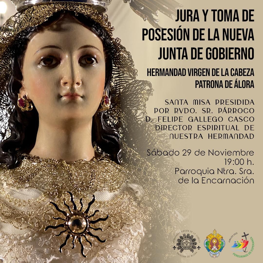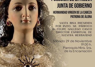 El día Sábado 29 de Noviembre en la Celebración de la Santa Misa en la Parroquia de Ntra. Sra. de la Encarnación tendrá lugar la Jura y Posesión de la Nueva Junta de Gobierno de la Hermandad Virgen de la Cabeza , Patrona de Álora a las 19:00 horas