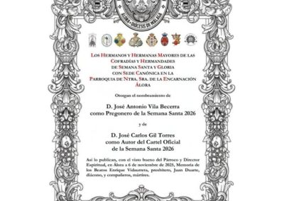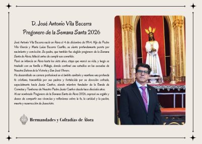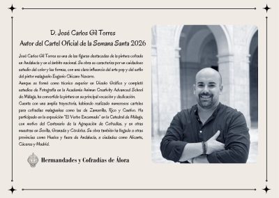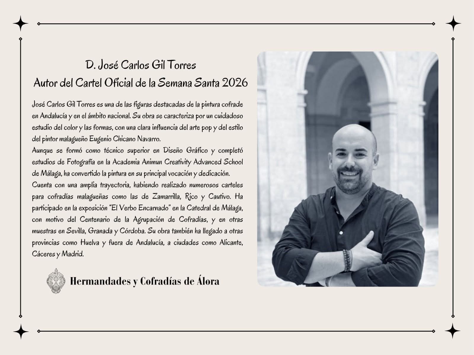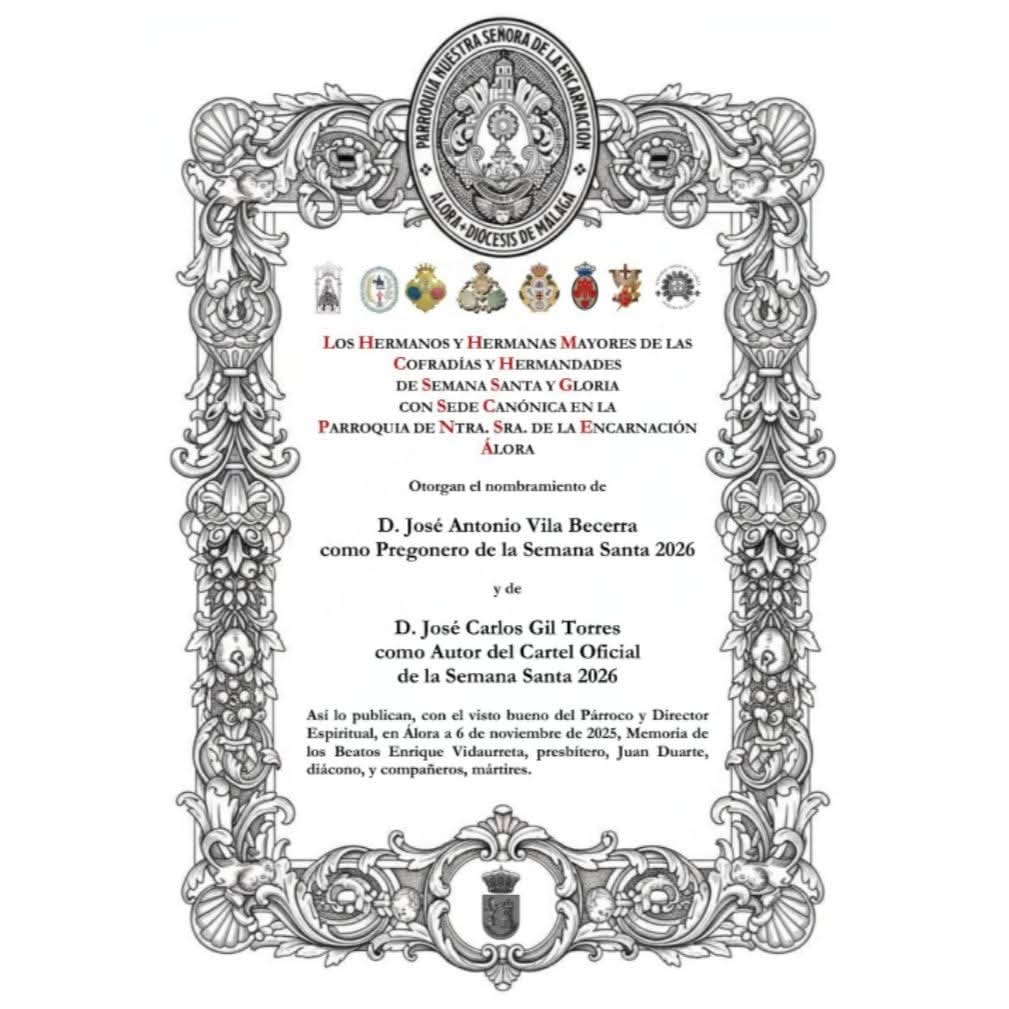 Los Hermanos y Hermanas Mayores de las Cofradías y Hermandades de Semana Santa y Gloria con Sede Canónica en la Parroquia Ntra. Sra. de la Encarnación de Álora han otorgado el nombramiento de pregonero y autor de cartel de la Semana Santa 2026.