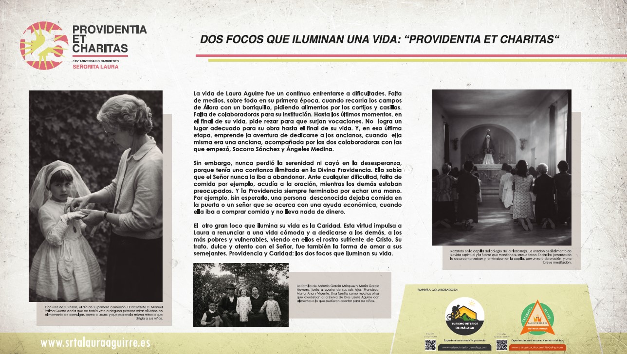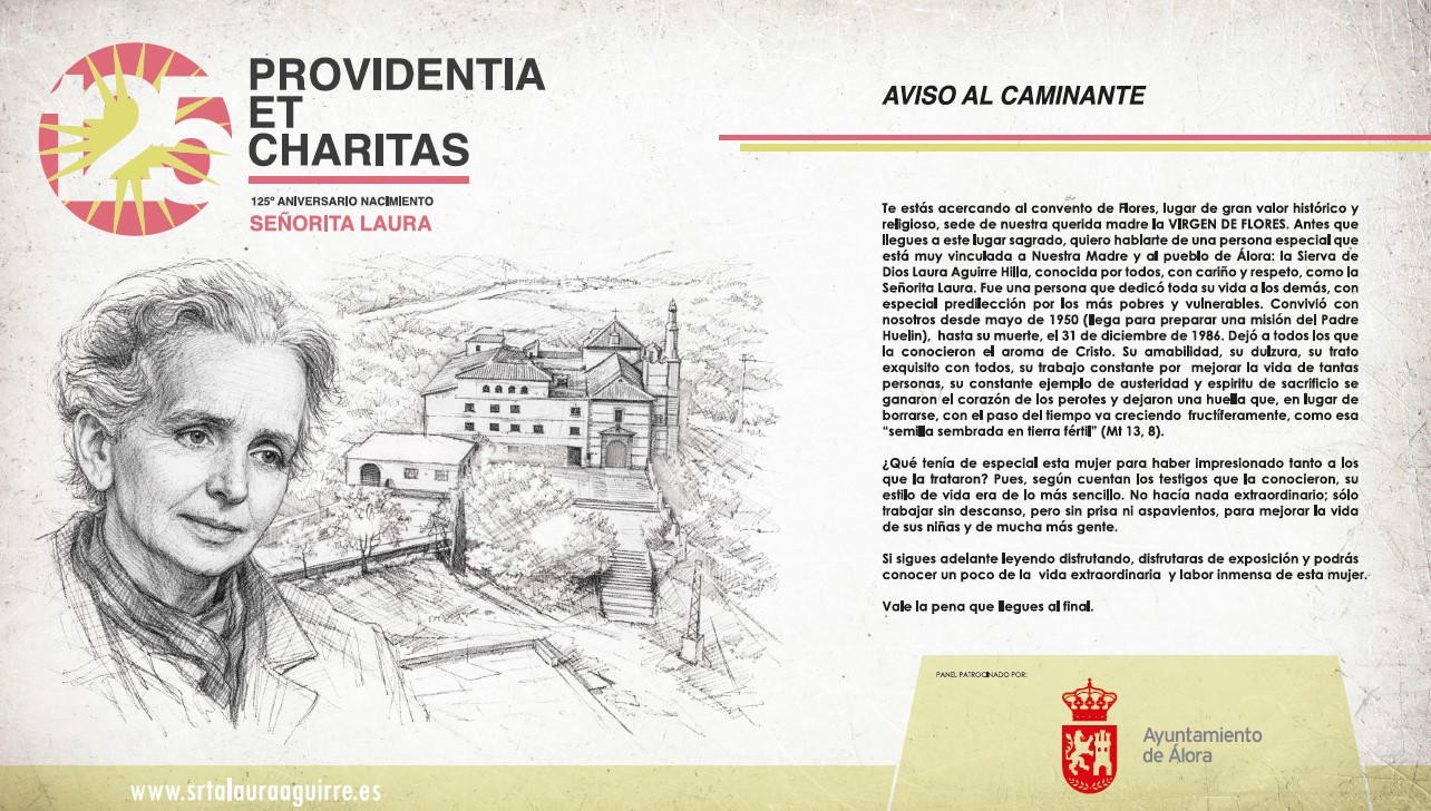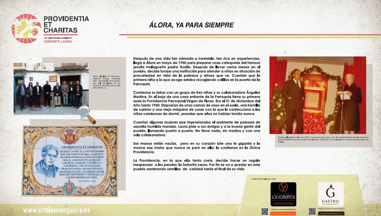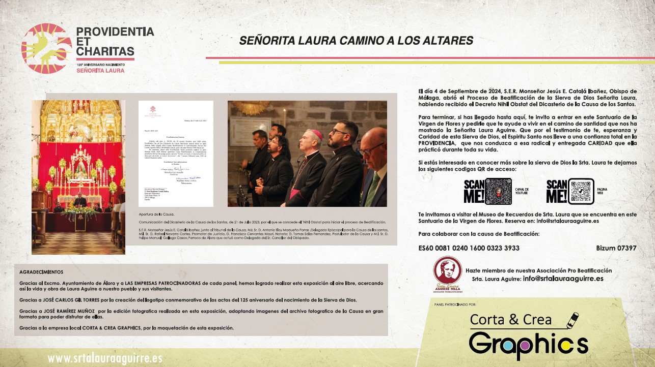 Aquí les mostramos los paneles de la exposición SRTA LAURA : UNA VIDA PARA LOS DEMÁS , inaugurada el día de ayer 24 de Marzo de 2026 con motivo de su 125 aniversario de su nacimiento. En la inauguración, además de tener la presencia en este día la memoria de la Sierva de Dios numerosas personas y fieles del pueblo de Álora con su párroco don Felipe Manuel Gallego Casco y don Tomás Salas Fernández, postulador de la causa y presidente de Asociación Pro Beatificación Srta. Laura Aguirre, organizadora de la exposición, nos acompañó en esta tarde tan especial el Obispo emérito de Málaga S.E. Monseñor Jesús Esteban Catalá Ibáñez.