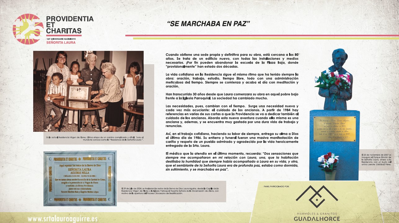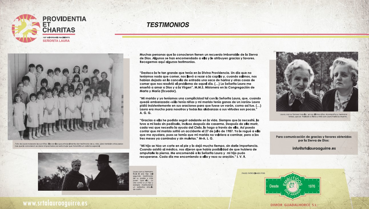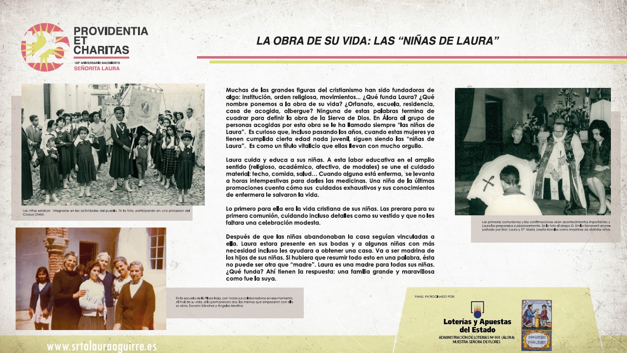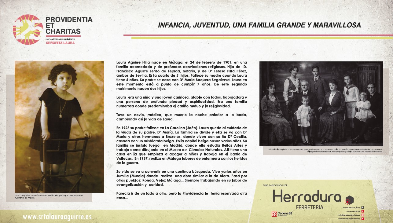 Aquí les mostramos los paneles de la exposición SRTA LAURA : UNA VIDA PARA LOS DEMÁS , inaugurada el día de ayer 24 de Marzo de 2026 con motivo de su 125 aniversario de su nacimiento. En la inauguración, además de tener la presencia en este día la memoria de la Sierva de Dios numerosas personas y fieles del pueblo de Álora con su párroco don Felipe Manuel Gallego Casco y don Tomás Salas Fernández, postulador de la causa y presidente de Asociación Pro Beatificación Srta. Laura Aguirre, organizadora de la exposición, nos acompañó en esta tarde tan especial el Obispo emérito de Málaga S.E. Monseñor Jesús Esteban Catalá Ibáñez.